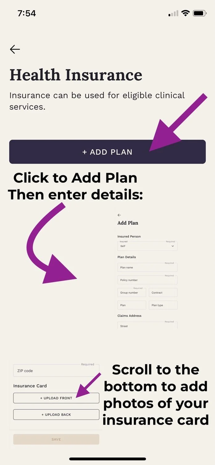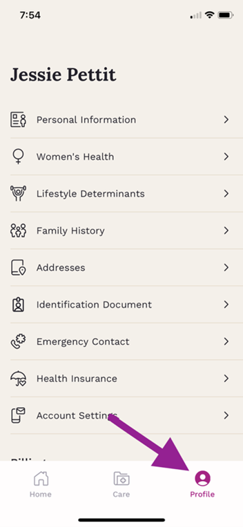 3. If you wish to use your health insurance for labs, imaging like xrays or mammograms, or medications, please click the bottom right “Profile” button as pictured above from the home screen of the app, and then click “Health Insurance” to enter your plan details and upload a copy of your insurance card. Please bring your insurance card to our visits so we can double check details before I place any orders that you may want to run through your insurance.