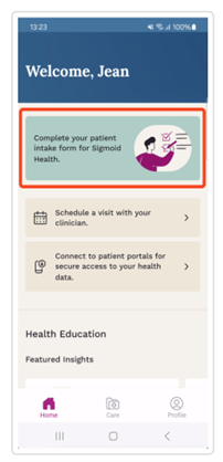 2. Once you have downloaded the app, please complete the Patient Intake Process by tapping the box to complete the patient intake form for Sigmoid Health (and no, I don’t know why it’s SigmaMD and Sigmoid Health in different places!)